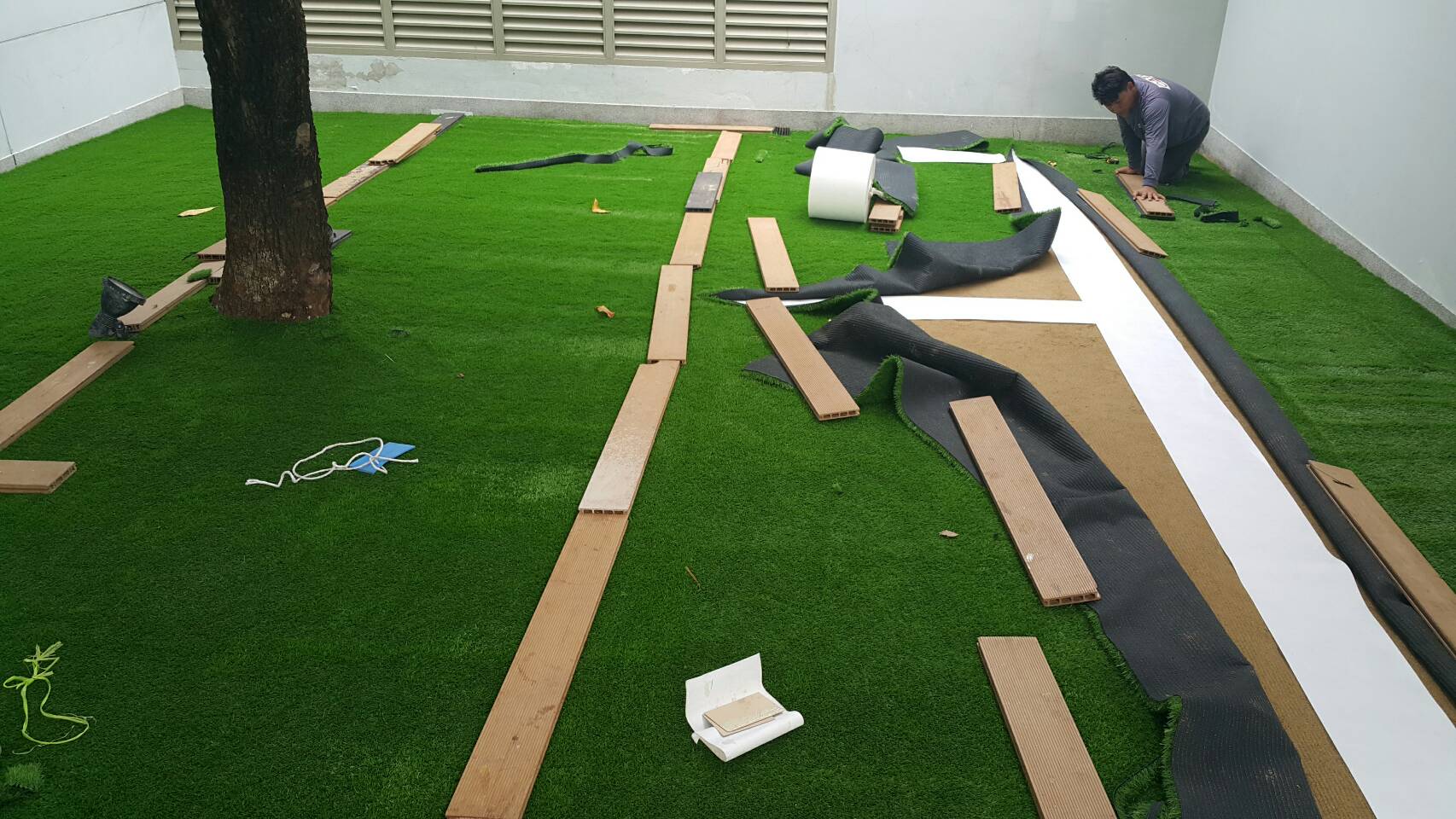 ใช้คัตเตอร์ตัดหญ้าเทียม และจัดเตรียมหญ้าที่จะปูในพื้นที่นั้นๆ